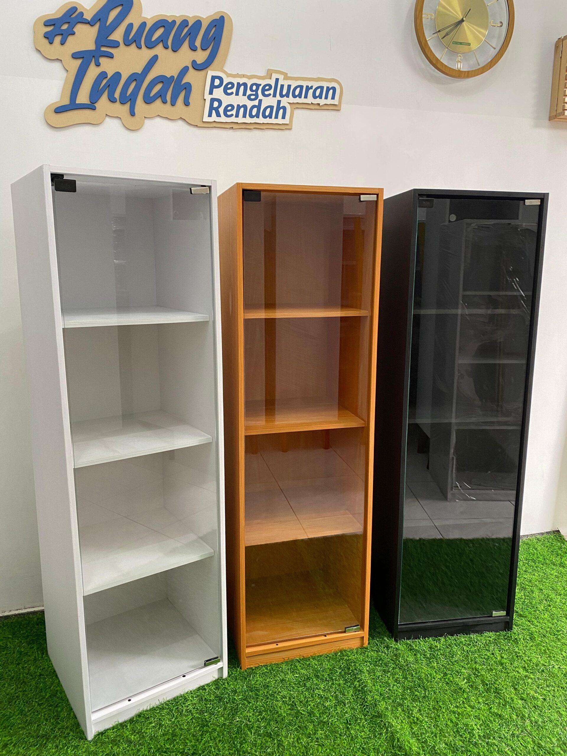 Tampilkan koleksi dan dekorasi rumah Anda dengan Lemari Kaca Single Minimalis.