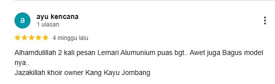 Alhamdulillah 2 kali pesan Lemari Alumunium puas bgt.. Awet juga Bagus model nya..